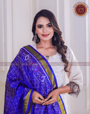 Elevate your attire with our exquisite Single Ikkat Patola Dupatta, featuring the timeless Bandhani design in vibrant Blue hues, accented with a captivating Ghugharo border in rich red.