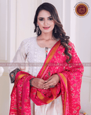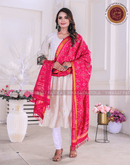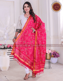 Elevate your attire with our exquisite Single Ikkat Patola Dupatta, featuring the timeless Navratna design in vibrant Pink hues, accented with a captivating Normal border in rich red.