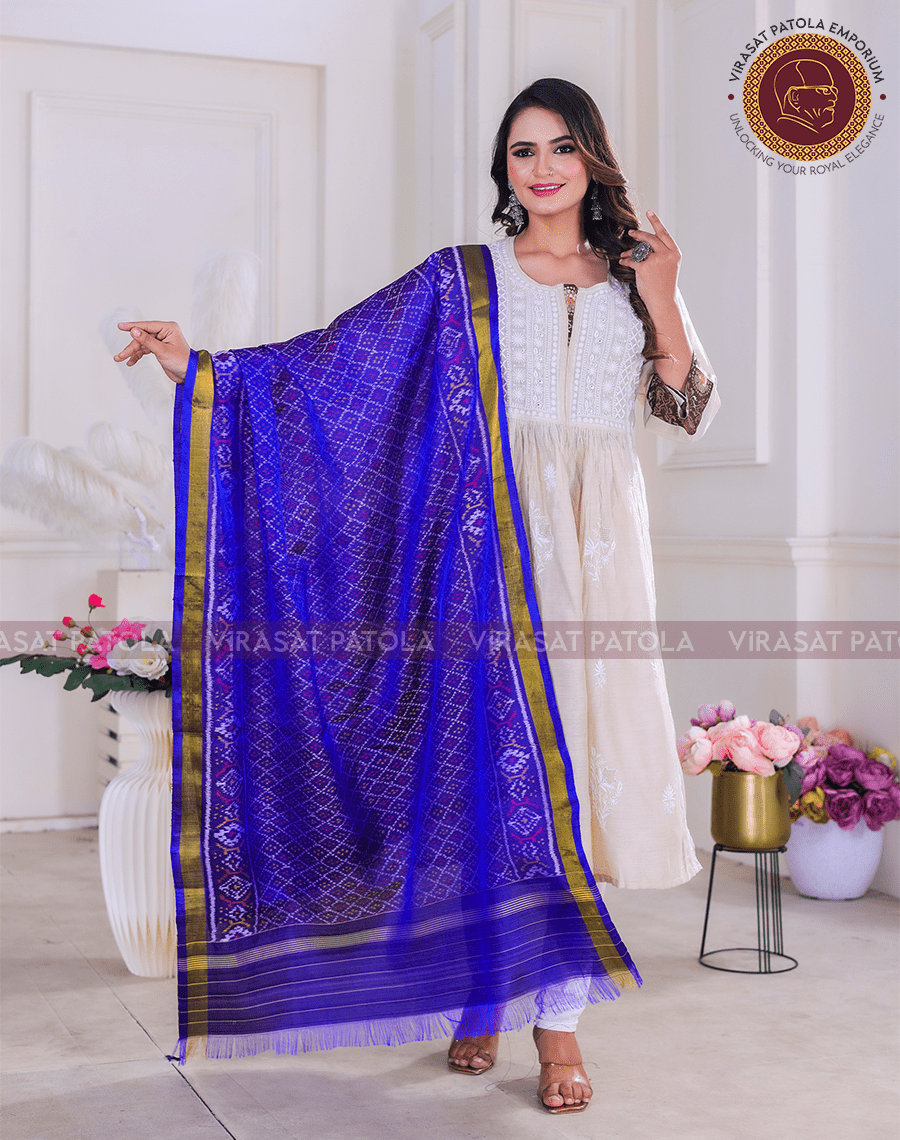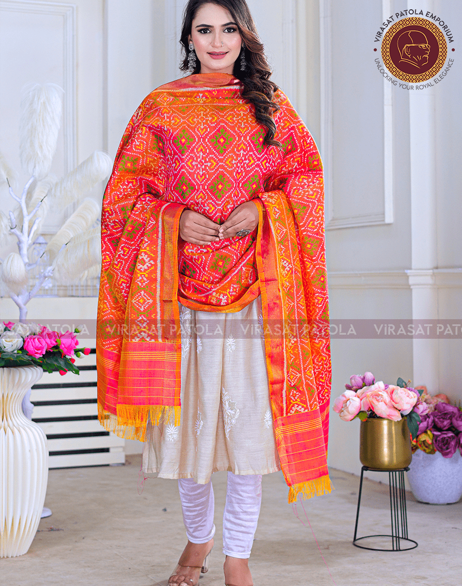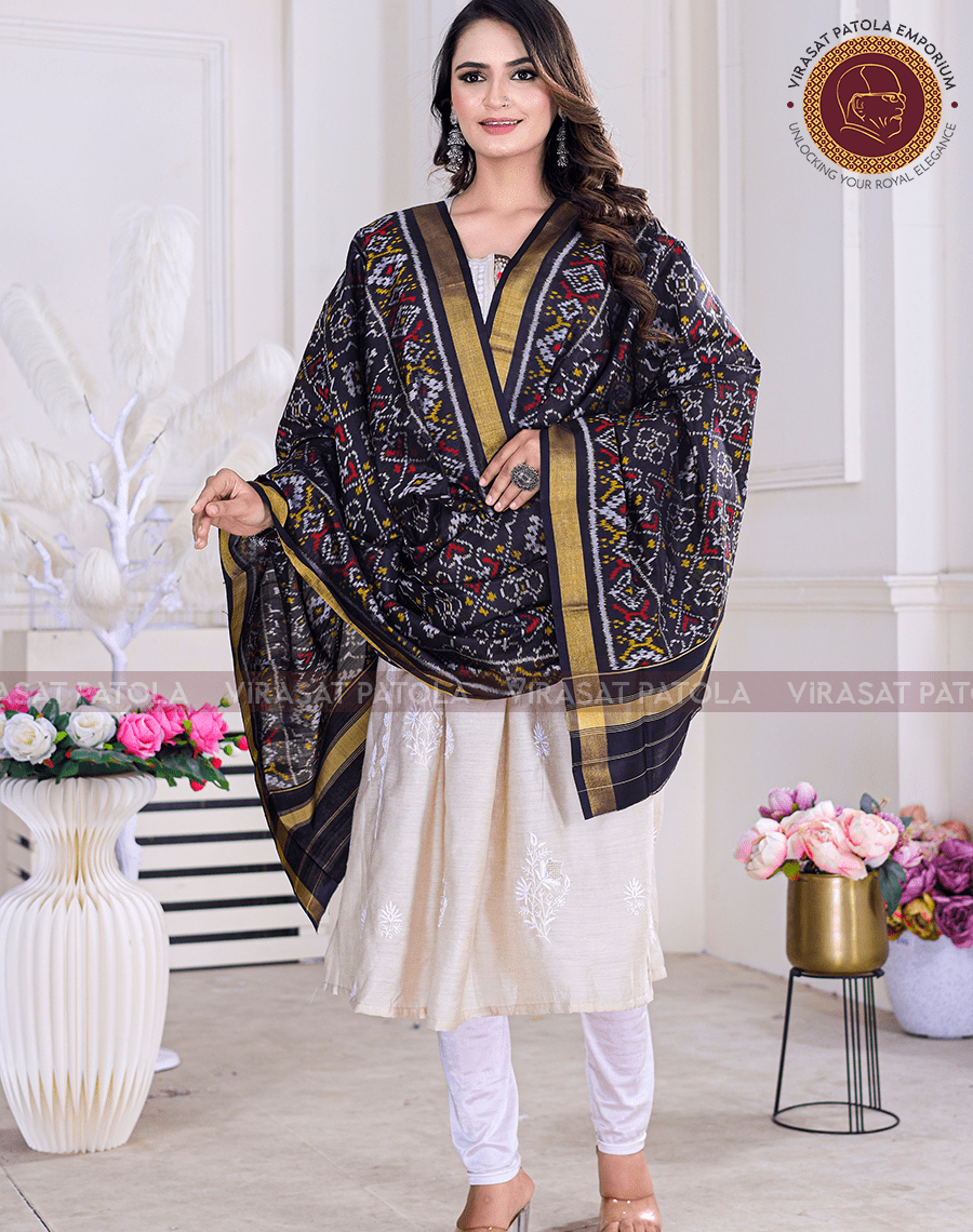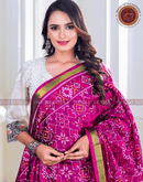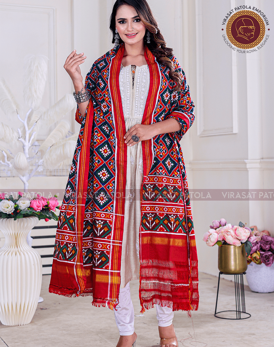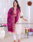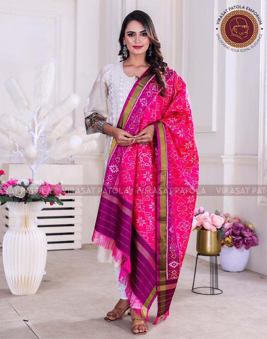Elevate your attire with our exquisite Single Ikkat Patola Dupatta, featuring the timeless Manekchawk design in vibrant Wine hues, accented with a captivating Sellari border in rich red.