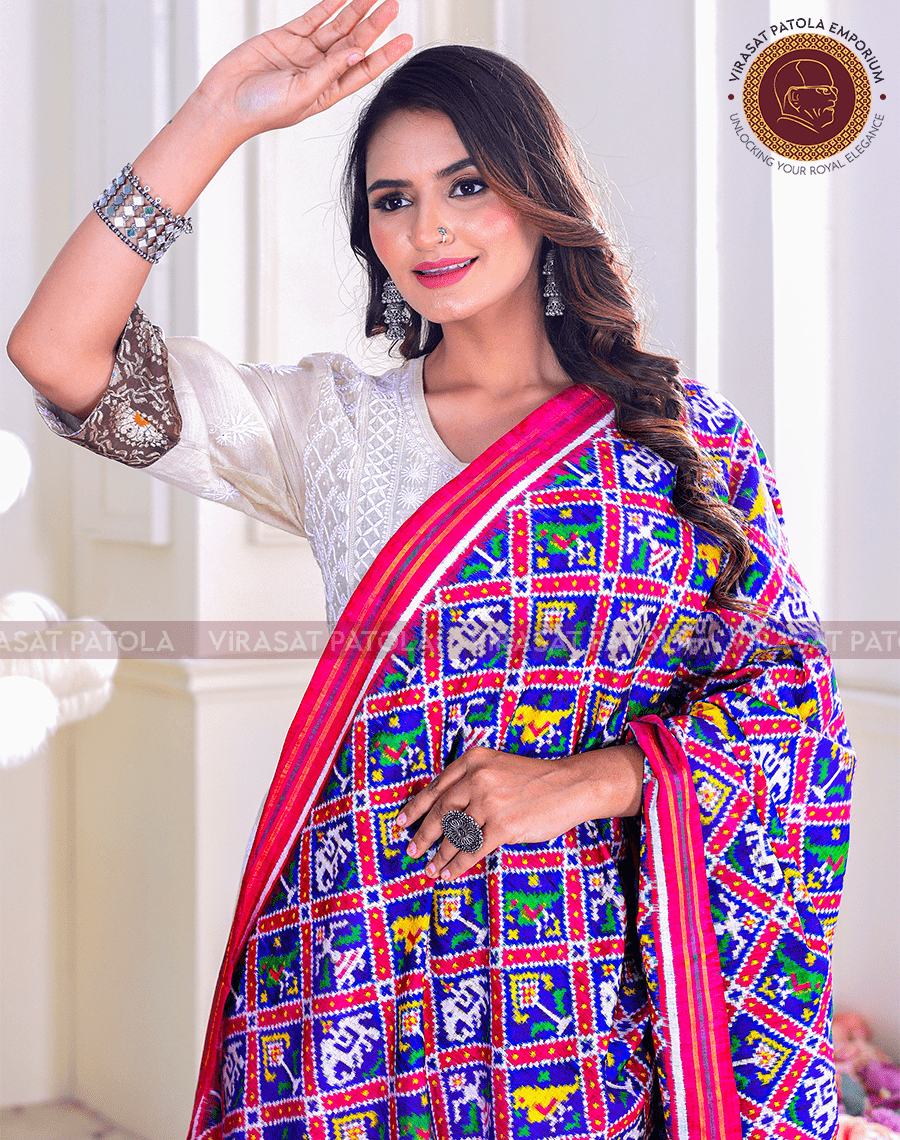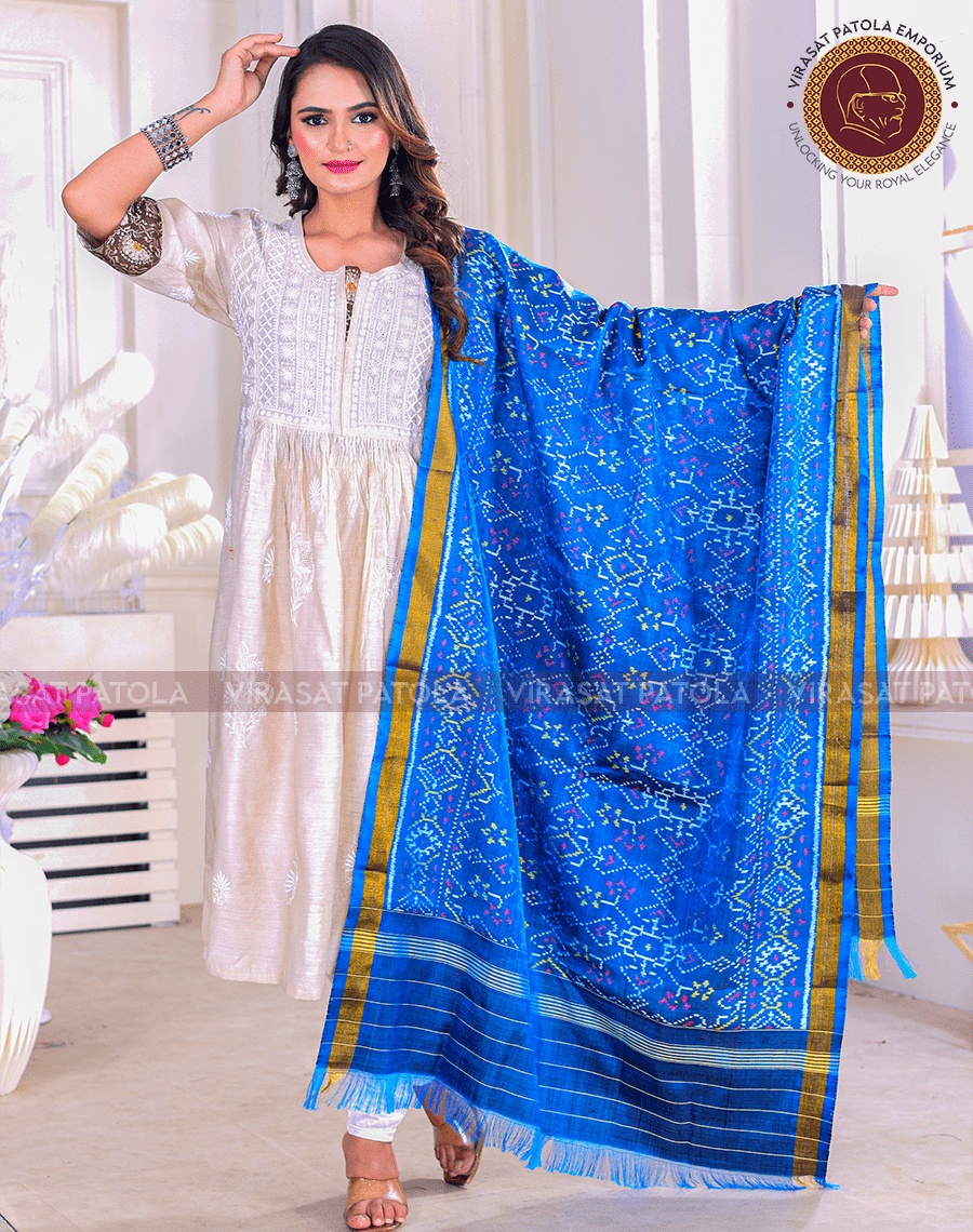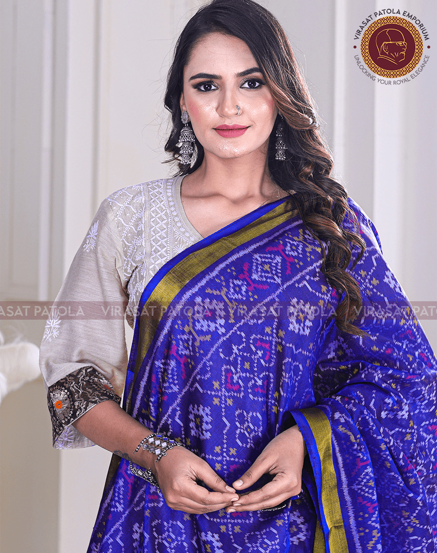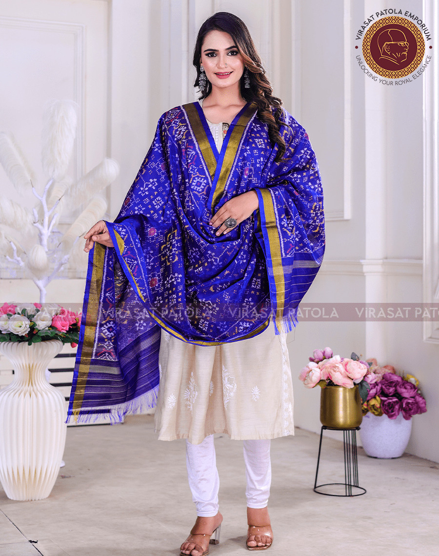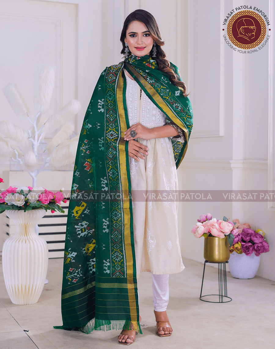 Elevate your attire with our exquisite Single Ikkat Patola Dupatta, featuring the timeless Manekchawk design in vibrant Wine hues, accented with a captivating Sellari border in rich red.