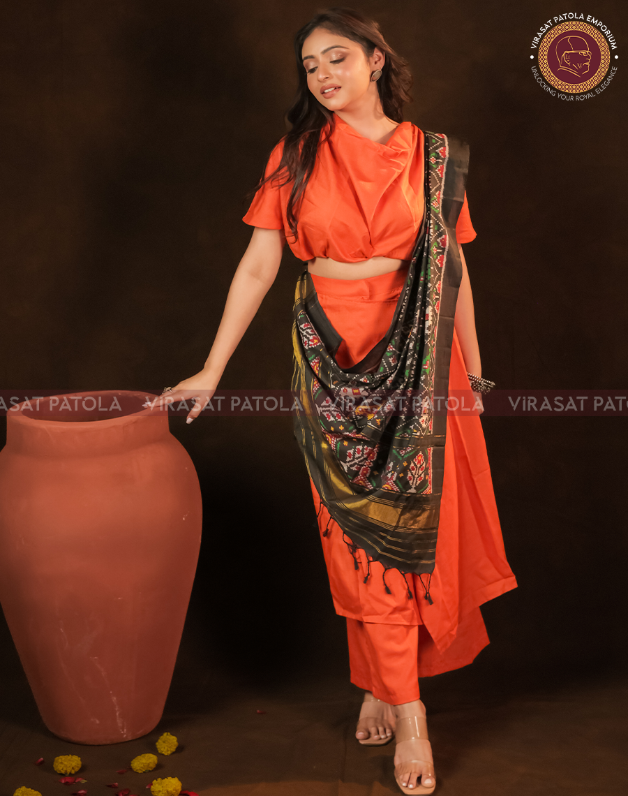 Elevate your attire with our exquisite Semi Ikkat Patola Dupatta, featuring the timeless Nari Kunjar design in vibrant Black hues, accented with a captivating attractive border.