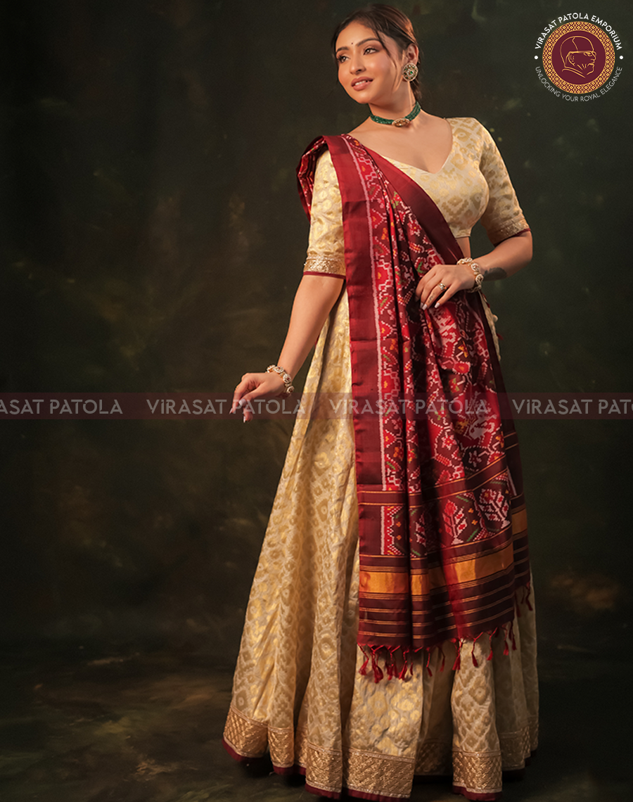 Elevate your attire with our exquisite Semi Ikkat Patola Dupatta, featuring the timeless Nari Kunjar design in vibrant Maroon hues, accented with a captivating attractive border.