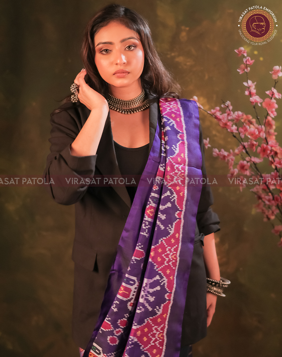 Elevate your attire with our exquisite Semi Ikkat Patola Dupatta, featuring the timeless Chhabadi design in vibrant Violet hues, accented with a captivating attractive border.