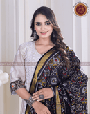 Elevate your attire with our exquisite Single Ikkat Patola Dupatta, featuring the timeless Panchanda design in vibrant Black hues, accented with a captivating Sellari border in rich red.