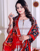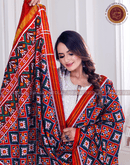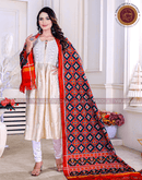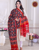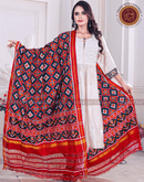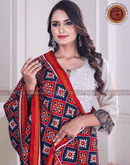 Elevate your attire with our exquisite Double Ikkat Patola Dupatta, featuring the timeless Panchanda design in vibrant Red hues, accented with a captivating Ghugharo border in rich red.